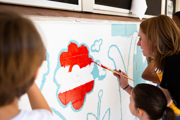 I worked with the wonderful teachers and families at Goodwood Primary School to create this sweet mural. The students were asked to contribute ideas in the design stage, and we came up with "Little Gardeners", depicting different children working together to care for a community garden. The families then all joined in to help paint!